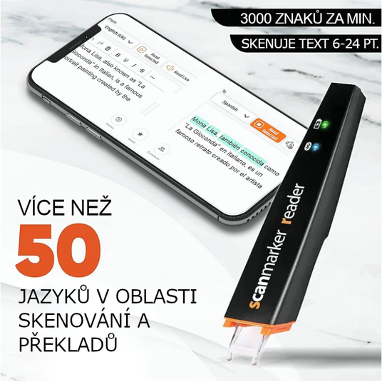 Scanmarker Reader skenuje a překládá do více než 100 jazyků, zobrazuje originální i přeložený text, což z něj činí výborný nástroj pro studenty jazyků. Integrované slovníky pomáhají s porozuměním materiálu a zlepšují čtení. Navíc obsahuje funkce Speech-to-Text.